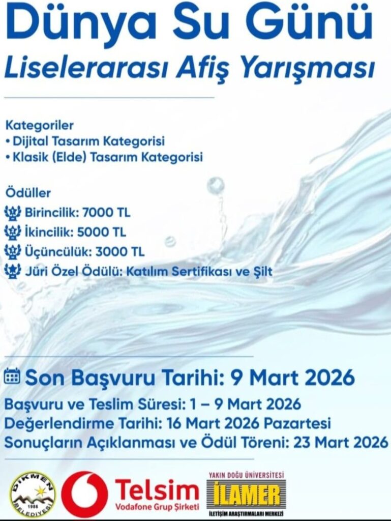 – 22 Mart Dünya Su Günü 2026 kapsamında düzenlenen bu yarışmanın amacı, lise öğrencilerinin su kaynaklarının korunması, suyun yaşam için taşıdığı önem ve sürdürülebilir gelecek bilinci üzerine düşünmelerini sağlamak, yaratıcılıklarını sanatsal biçimlerde ifade etmelerini teşvik etmektir.