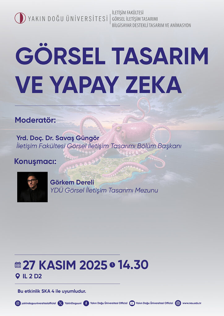Yakın Doğu Üniversitesi İletişim Fakültesi, Görsel İletişim Tasarımı Bölümü ile Bilgisayar Destekli Tasarım ve Animasyon Önlisans programı işbirliğiyle düzenlenen, Yapay Zeka ve Görsel Tasarım Söyleşisine görsel tasarımcı Görkem Dereli konuk oldu.